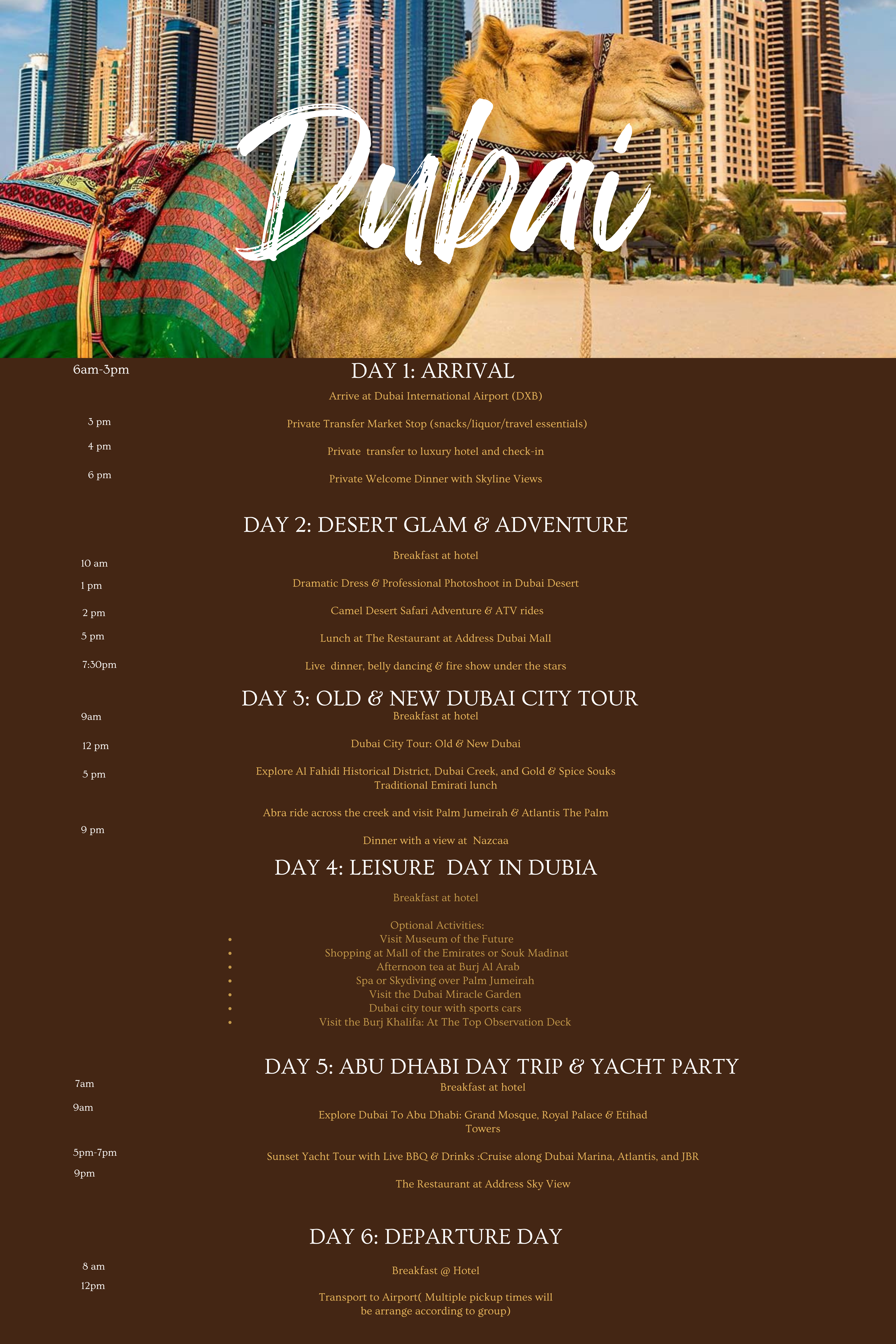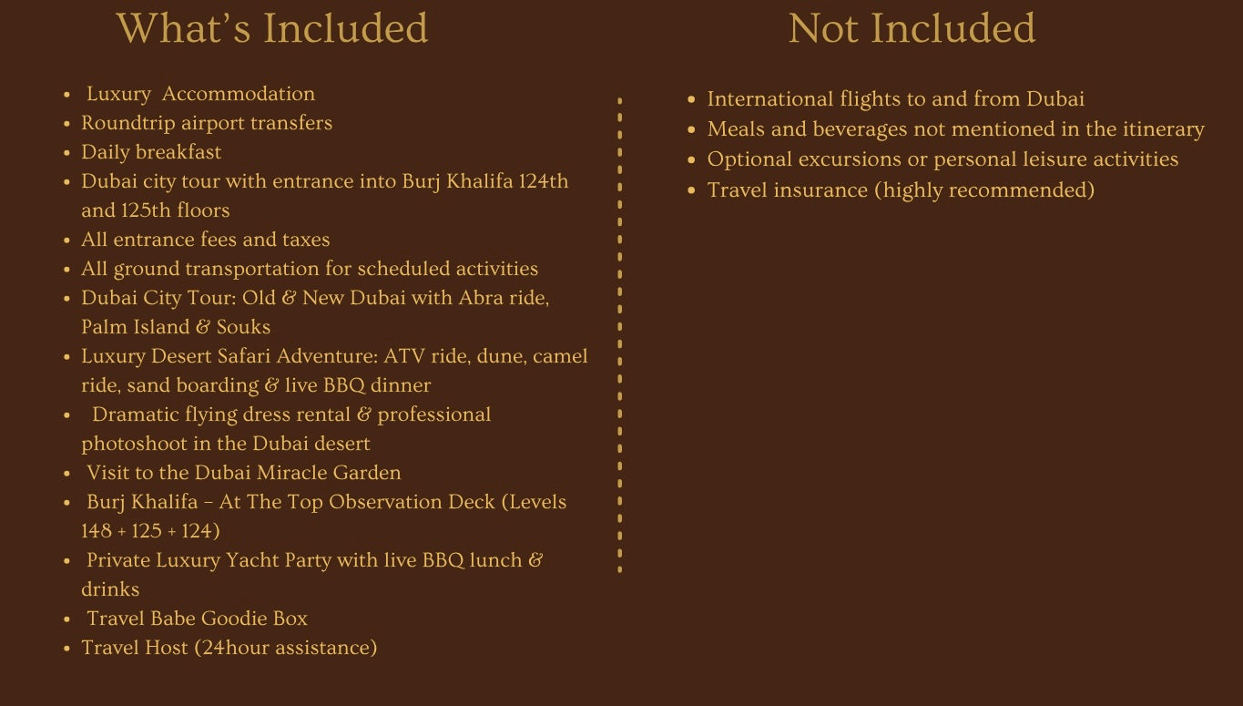 • 1–4 weeks before departure, you’ll be added to the official Dubai group chat (via WhatsApp) to stay connected and receive important trip updates.